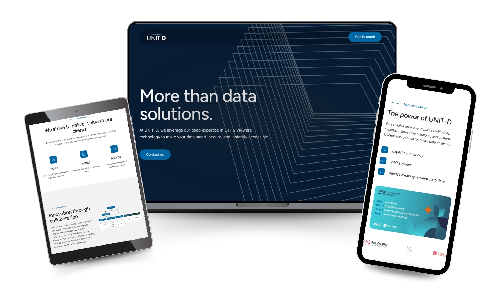 In samenwerking met UNIT-D werken hun kernwaarden en strategie grondig besproken: 'build', 'secure' en 'deliver' zijn centrale pijlers in hun aanpak. Samen met ons partnerbureau Unform werkten we aan de juiste look & feel: strak, technologisch georiënteerd, maar toch toegankelijk.